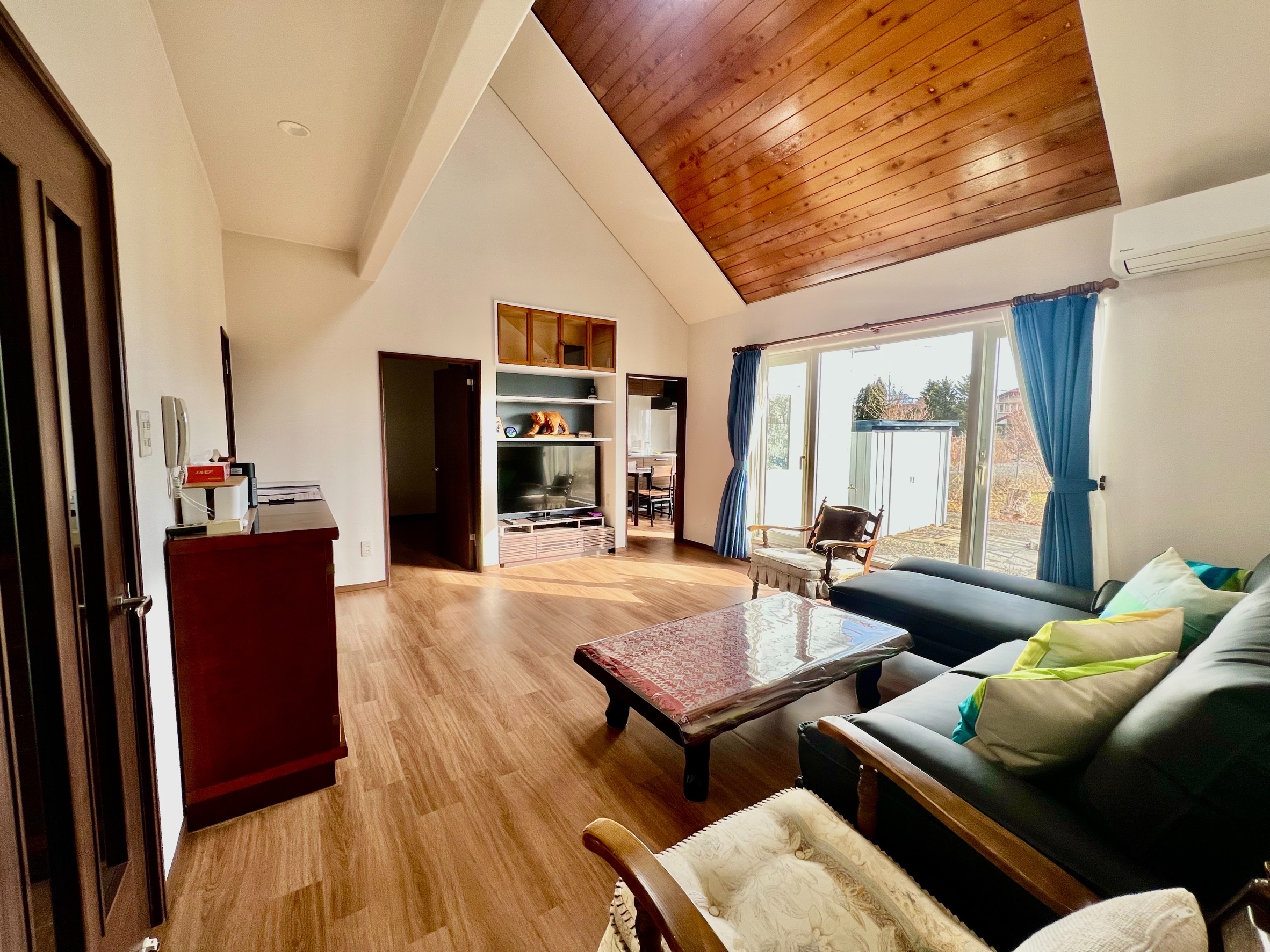 庭に面した大きな窓から自然光が差し込む、吹き抜けのある約18畳の開放感あふれるリビングです。天井が高く、人数でご利用いただいても圧迫感が少なく、ゆったりとお過ごしいただけます。 冬季は全面床暖房を完備しており、足元から暖かく快適にお過ごしいただけます。