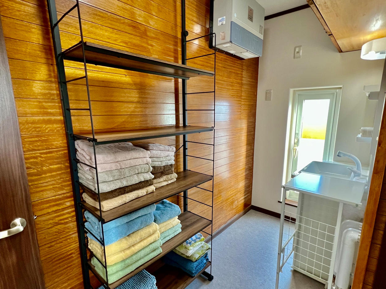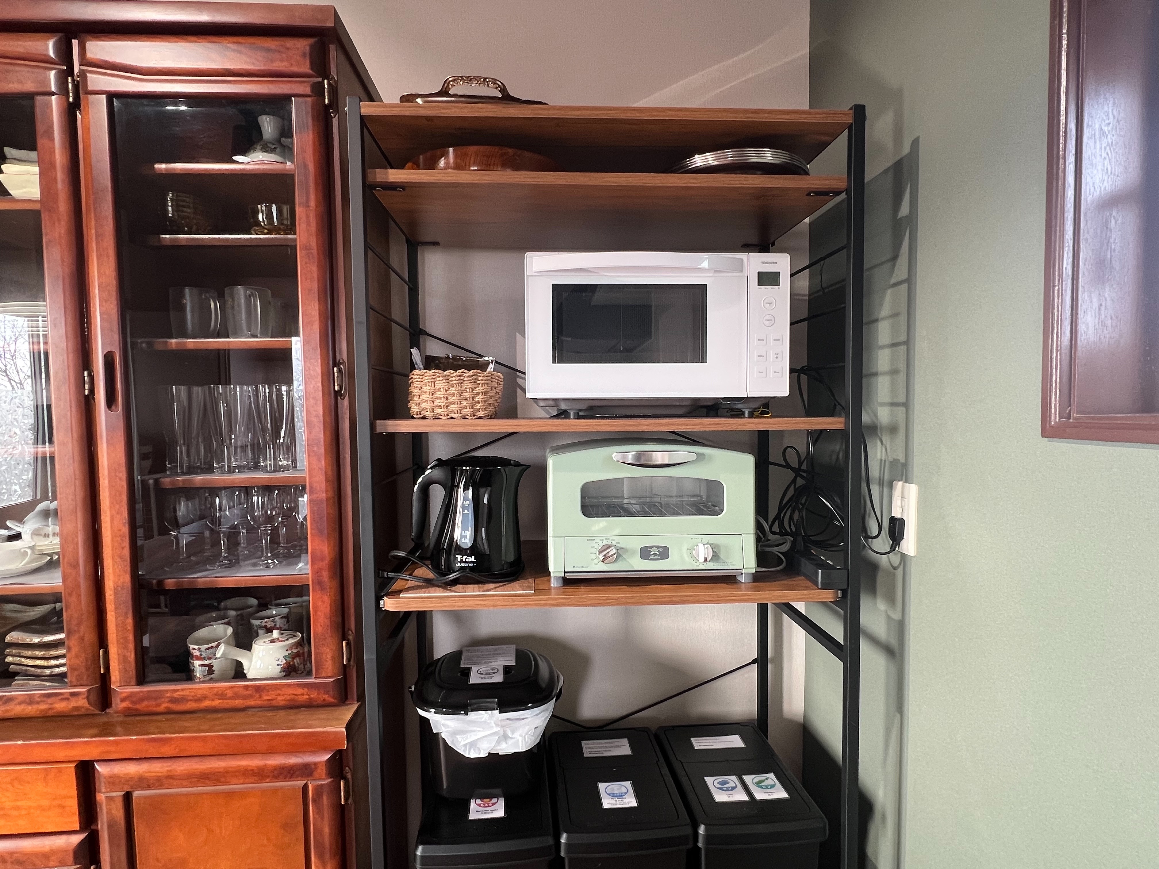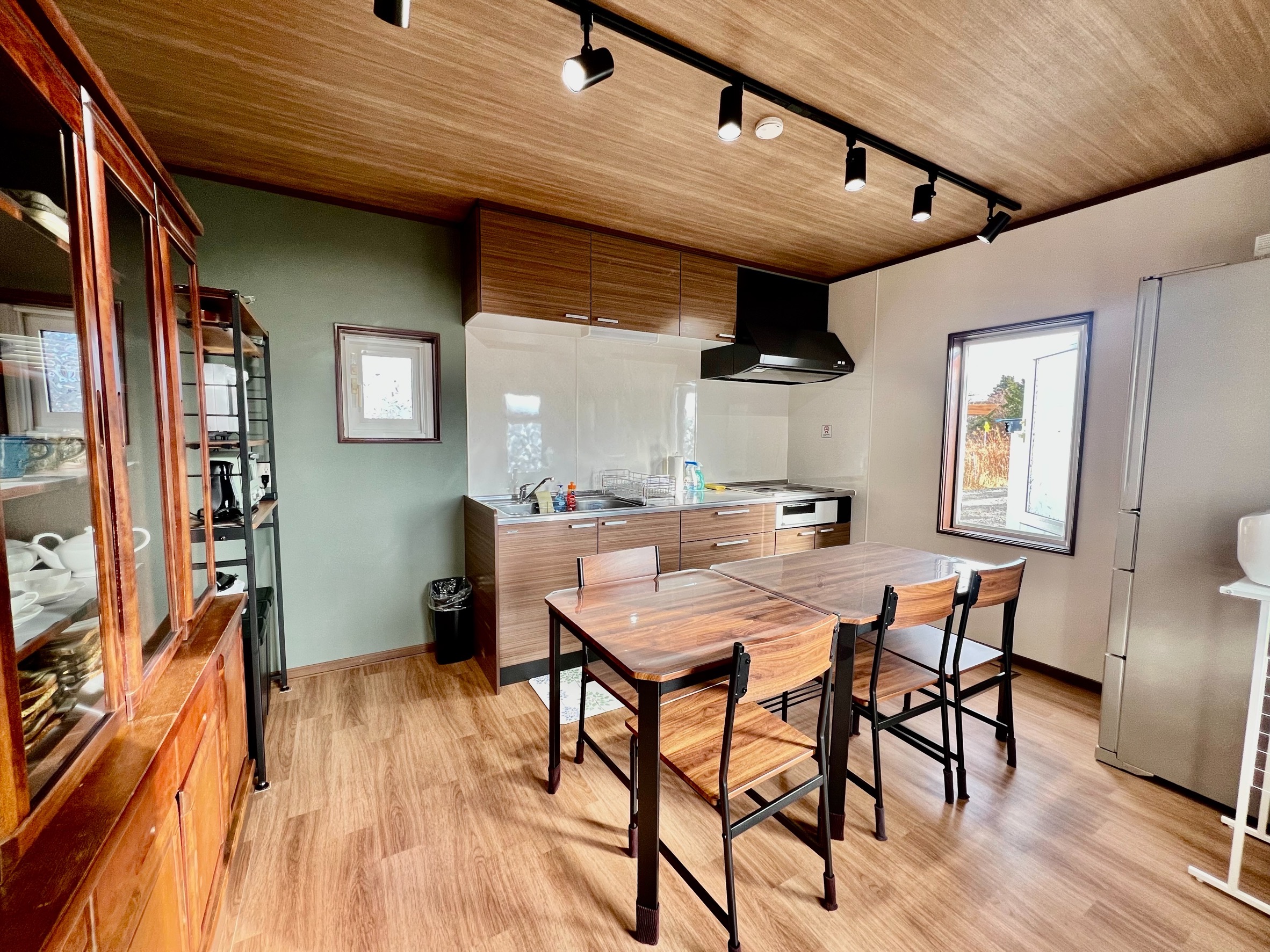 三つ口のIHコンロを備えたキッチンで、各種食器や調理器具を自由にご利用いただけます。 電子レンジ、トースター、炊飯器、冷蔵庫も完備しており、長期滞在やグループでのお食事にも便利です。 なお、カセットコンロやホットプレートのご利用をご希望の場合は、事前にお問い合わせください。